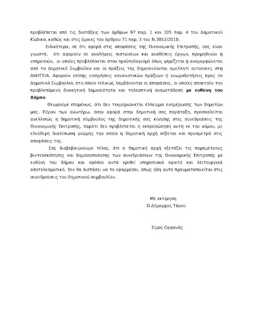 Με έγγραφο της οικονομικής επιτροπής υπογεγραμμένο από τον Δήμαρχο Τήνου κ. Ορφανό μας γνωστοποιείται ότι ο Δήμος νομιμοποιείται να χορηγεί ειδική άδεια μαγνητοσκόπησης και δημοσιοποίησης των συνεδριάσεων των οργάνων του, μόνο σε πρόσωπα ή εμπορικές συλλογικότητες που εμπίπτουν στη δικαιοδοσία ελέγχου της Εθνικής Επιτροπής Τηλεπικοινωνιών και Ταχυδρομείων (Ε.Ε.Τ.Τ.).